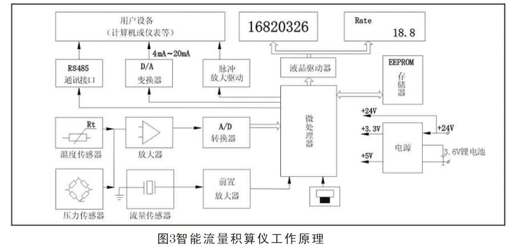 流量積算儀的原理框圖如圖3所示。CPU接收來自前置放大器的脈沖信號和經(jīng)A/D轉(zhuǎn)換器得到的壓力溫度信號,經(jīng)過運(yùn)算最終得到瞬時流量、累積流量、溫度和壓力值。同時,在LCD上顯示這些參數(shù)。流量顯示既可顯示標(biāo)況流量,也可顯示工況流量。儀表上的三個功能鍵,鍵、鍵和鍵可對內(nèi)部參數(shù)進(jìn)行設(shè)定。