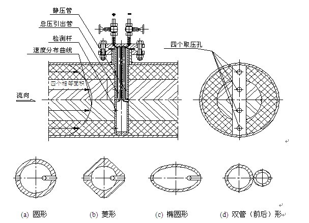 1、均速管流量計由檢測桿、取壓口和導桿組成。均速管的檢測管截面形狀分為圓形、菱形、橢圓形等多種結構。如圖所示。
